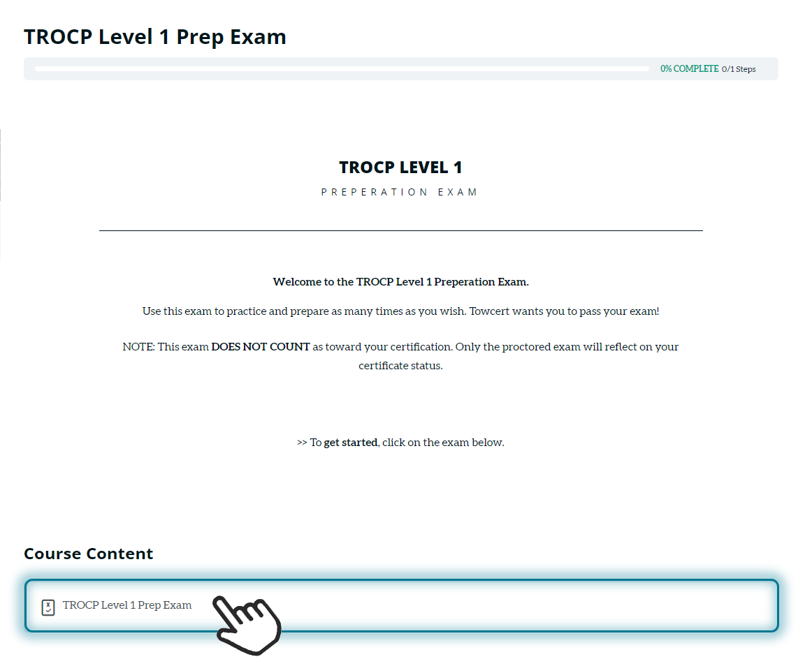 With the purchase of any proctored exam though towcert, you will receive access to a Prep Test for the purchased exam. You can access your prep tests though the “My Dashboard” page.